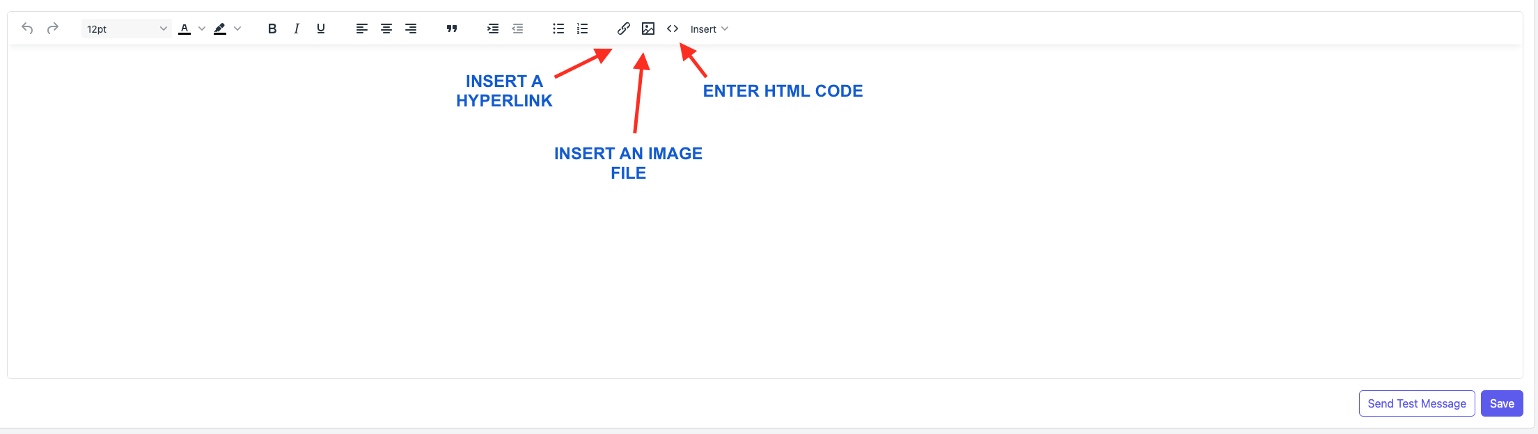 Toolbar: Use the toolbar to enhance your template with dynamic elements like images, hyperlinks, or custom HTML code.