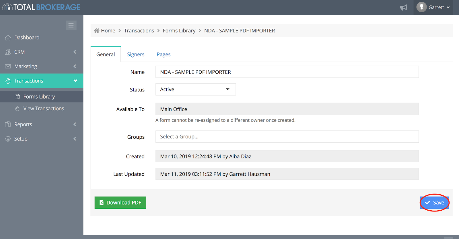 Start by finding your form in the “Forms Library” (click “Transactions” and then “Forms Library” on the left.