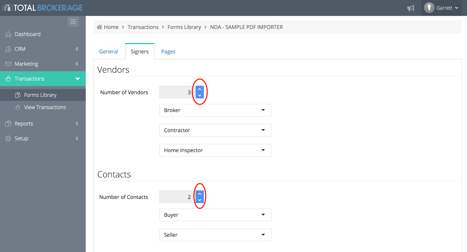 In order to change the number of vendors and signers, click the up and down arrows next to the numbers, then choose who the vendors and signers are.