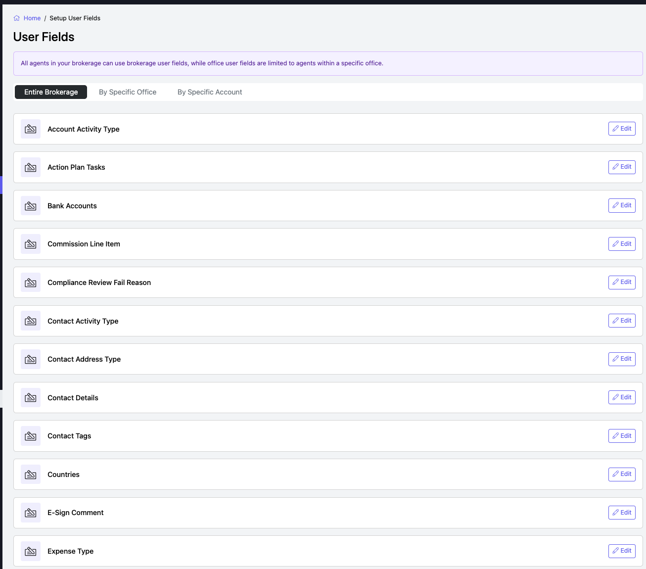 In order to edit or create new user fields, click on the Brokerage name, Office, or Account you want to edit them for.