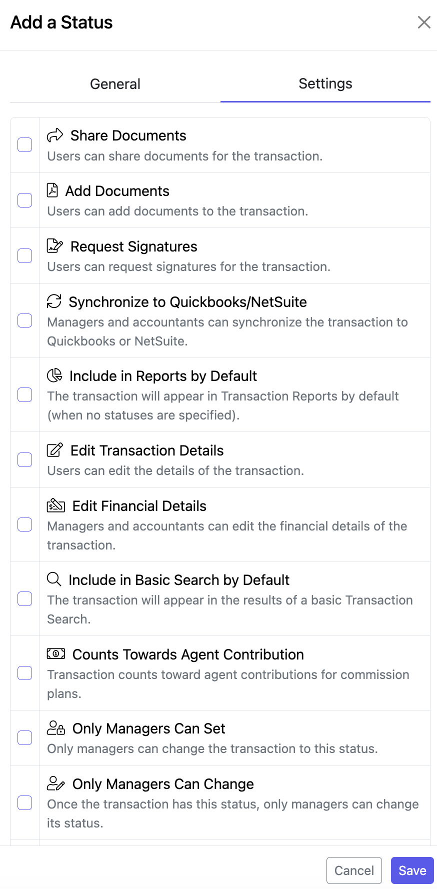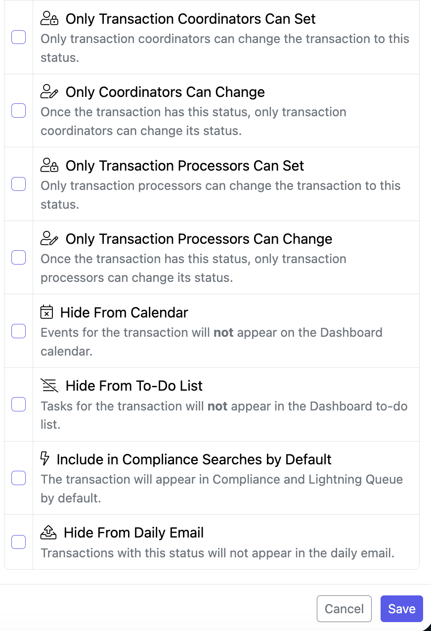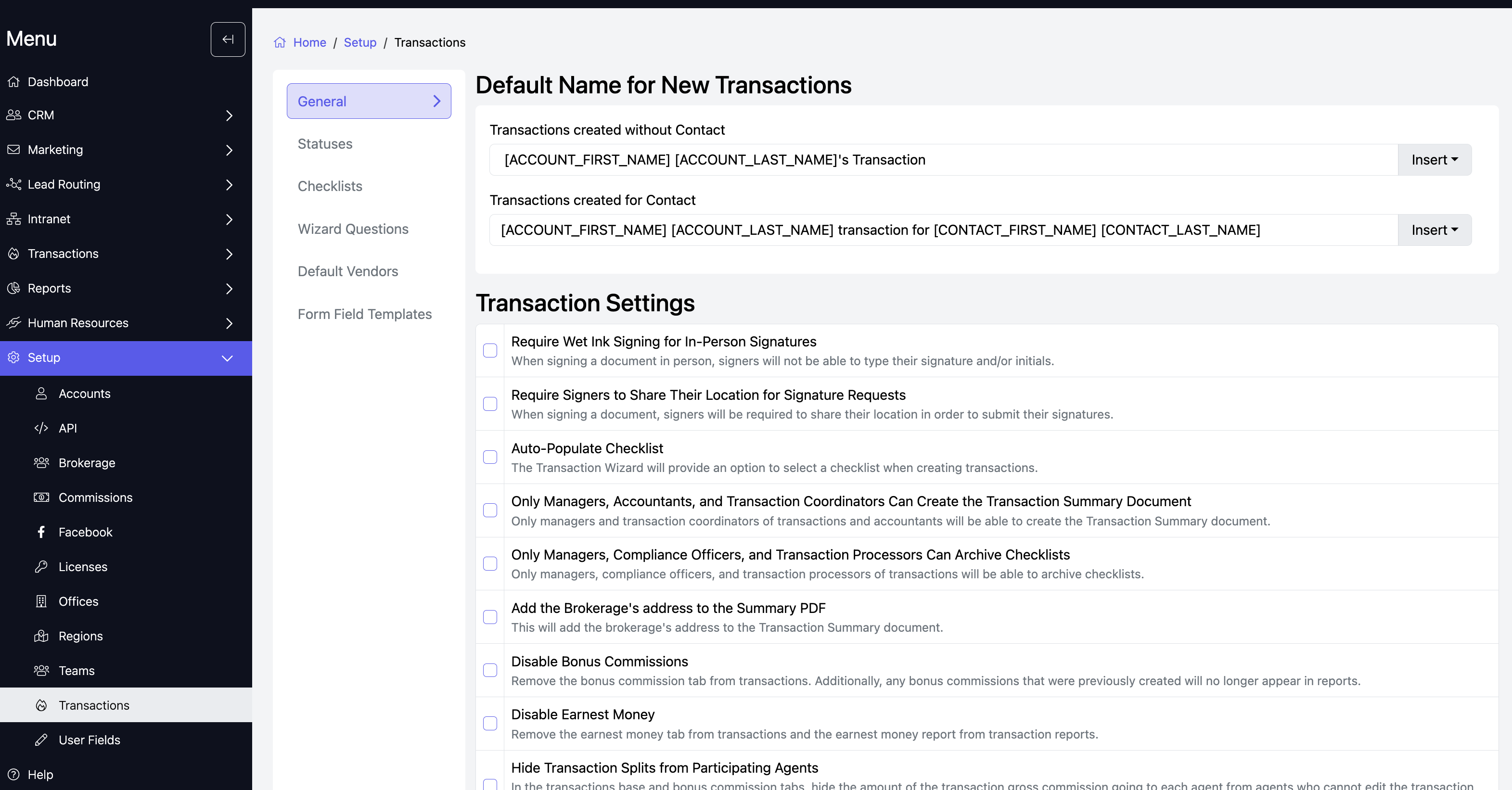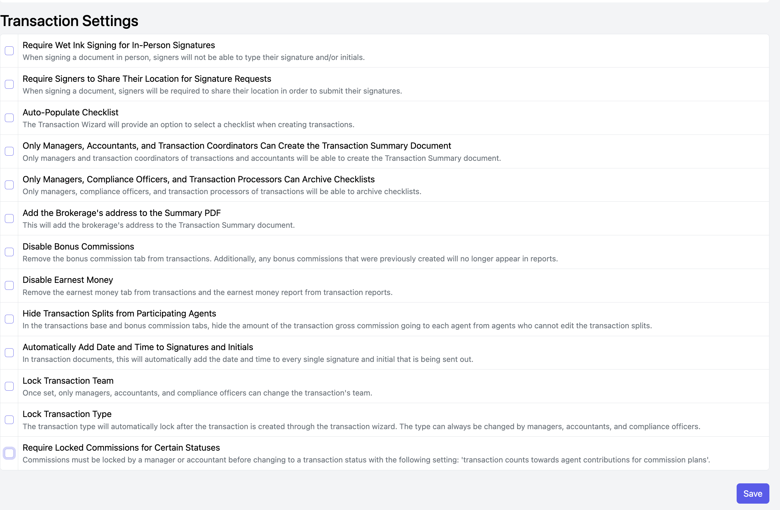 Only Managers, Accountants, and Transaction Coordinators Can Create the Transaction Summary Document: This document is a complete summary of the transaction information and is formatted to include the Broker's signature. Select this option to allow only these roles to create the document.
