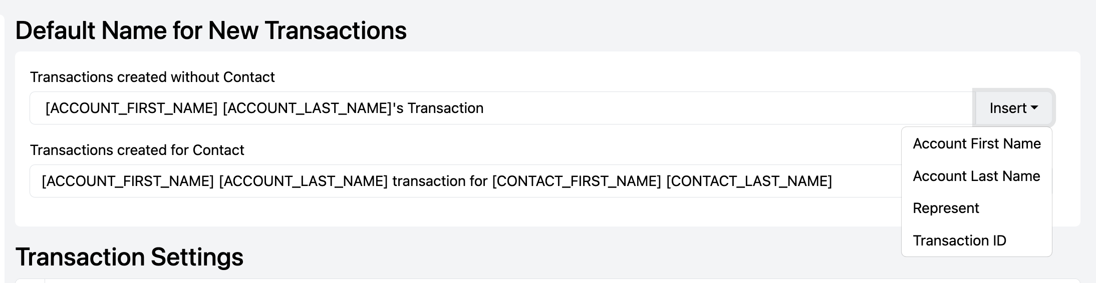 You will see that there are two different default transaction names. One is used if you create the transaction from within a contact, and the other is used if you create a transaction from the View Transactions page.
