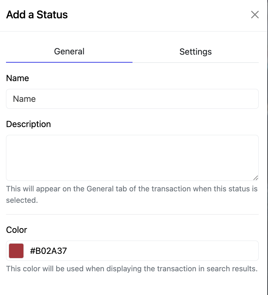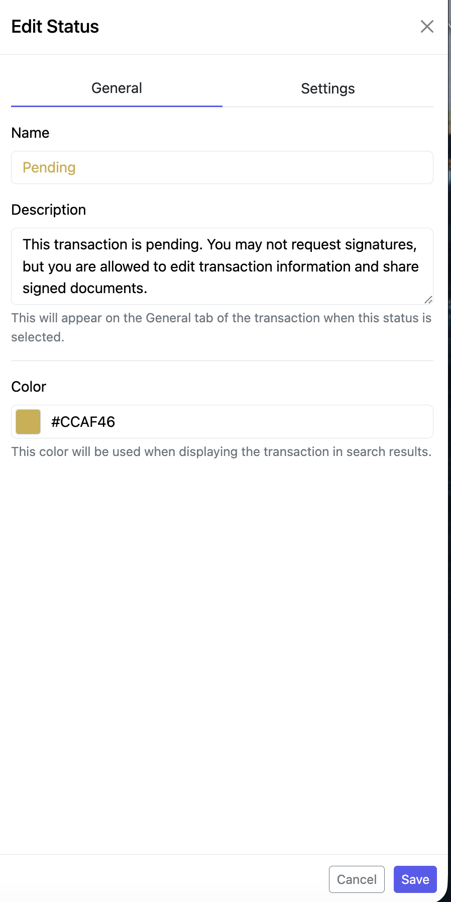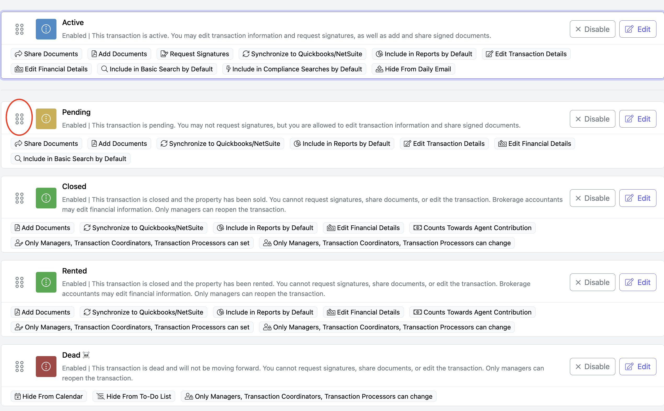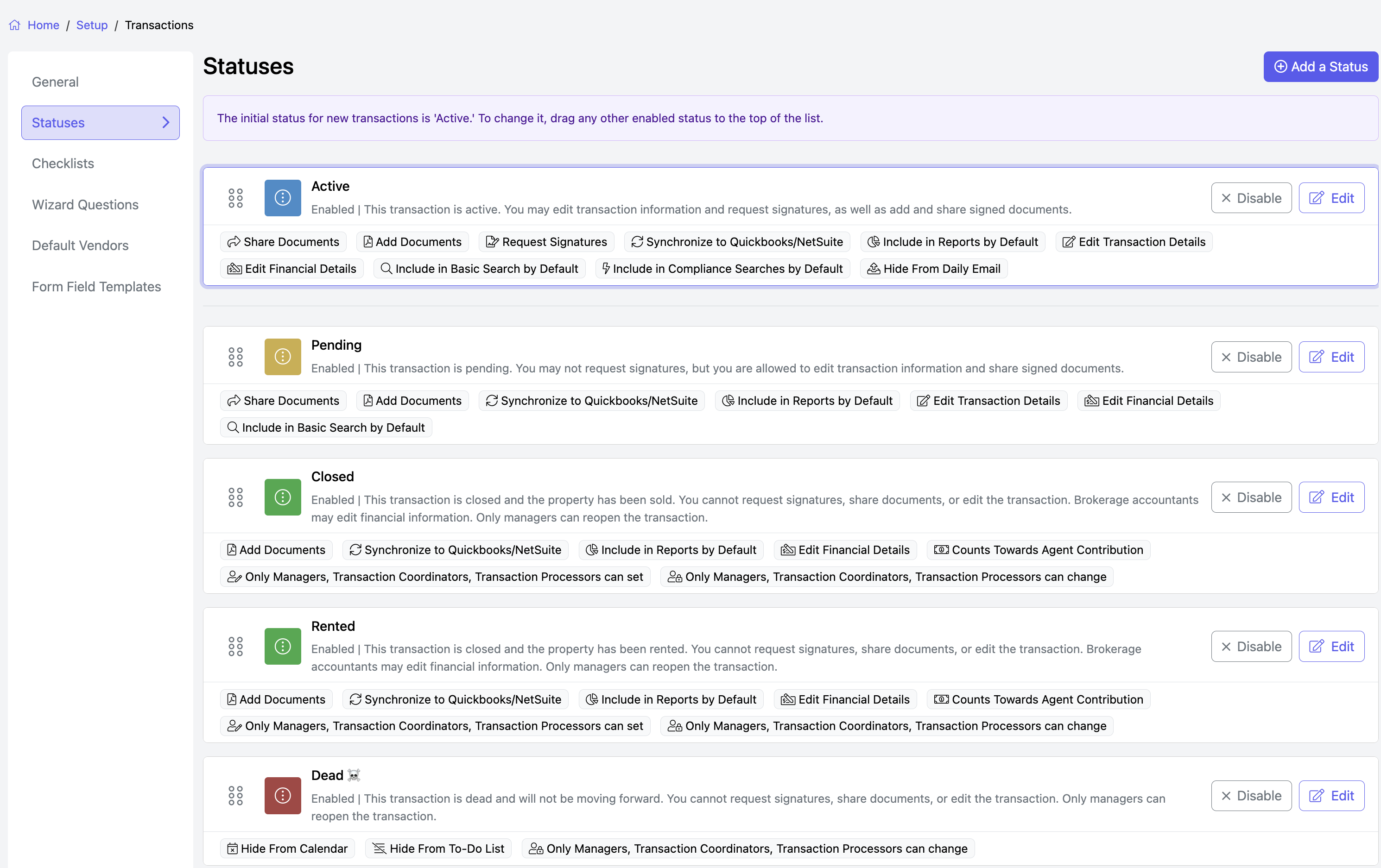 Click Edit to make changes to the settings. Changes made to statuses will apply to New transactions only.