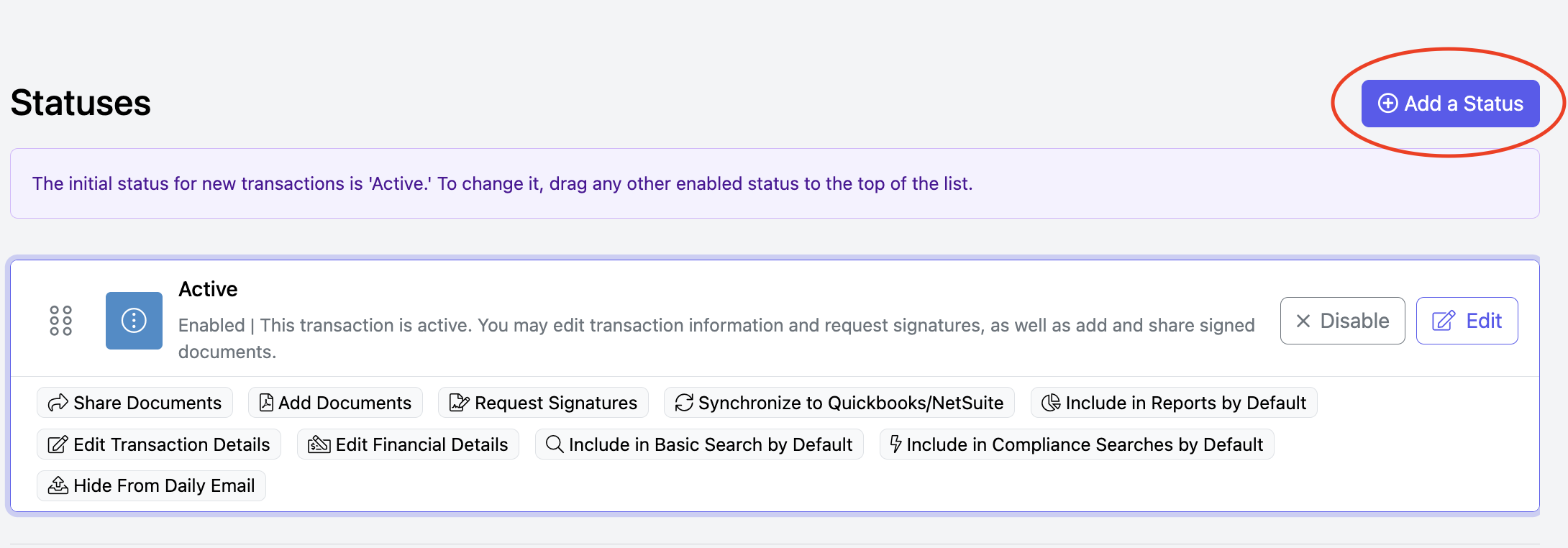 The initial status for new transactions is 'Active.' To change it, drag any other enabled status to the top of the list.