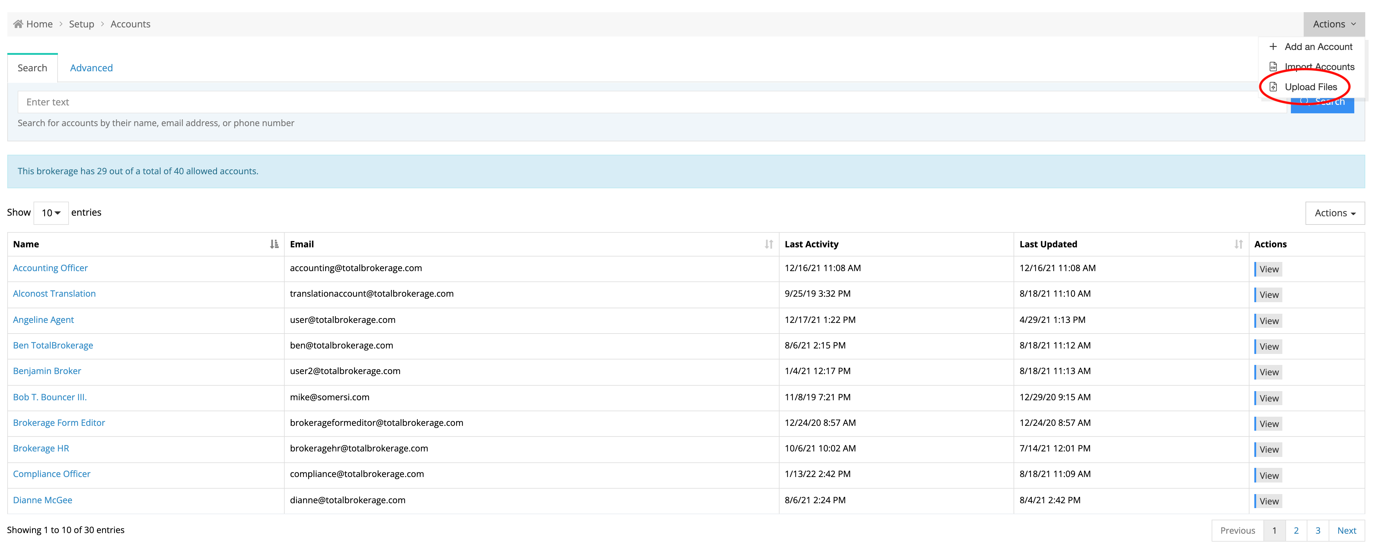 Managers and Human Resources Managers can upload files to multiple accounts at once in TotalBrokerage. Follow these steps to complete a bulk file upload efficiently.