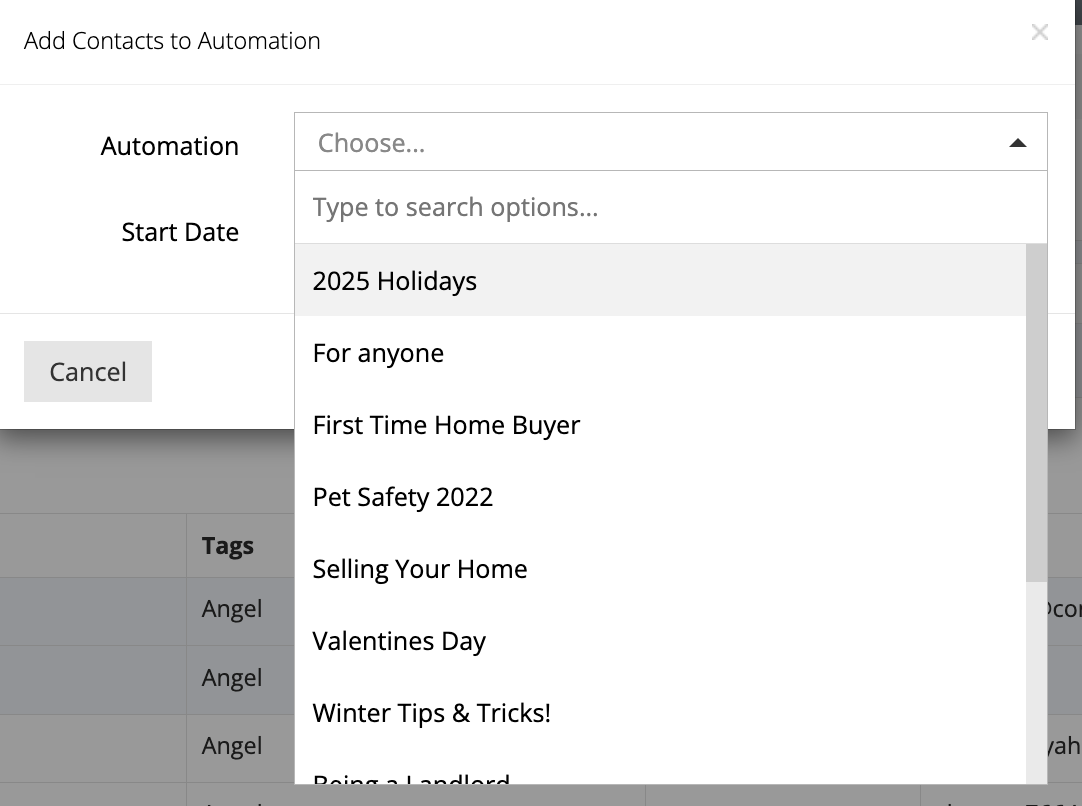 Automation Name: Select the name of the Automation by clicking the dropdown arrow (these are configured in Marketing → Automations)