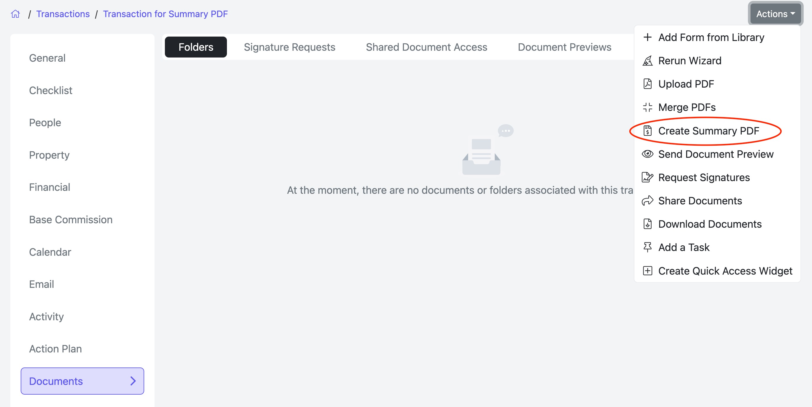 Add a summary document to the Documents tab. Any sensitive financial data contained in the document, such as agent splits, will be visible to all participating agents.