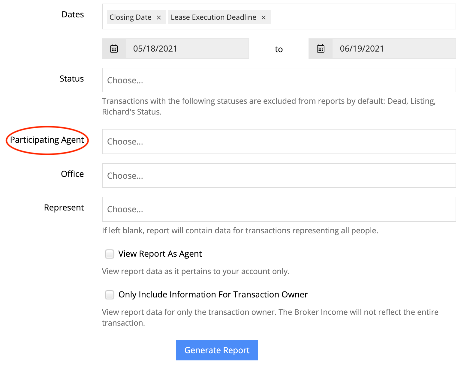 Participating Agent: Here, you can narrow your search by choosing which agents in your office or brokerage are included in the search. Your ability to select agents will be contingent on your assigned role in TotalBrokerage. You can only select yourself if you are an agent with no specified manager role. To do so, click inside the text box to the right of Participating Agent and select the appropriate agent (s) you want to include.