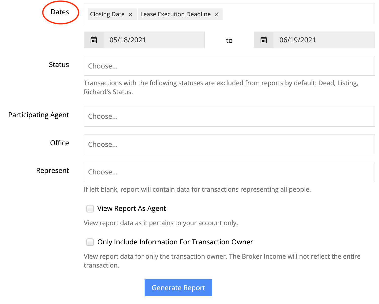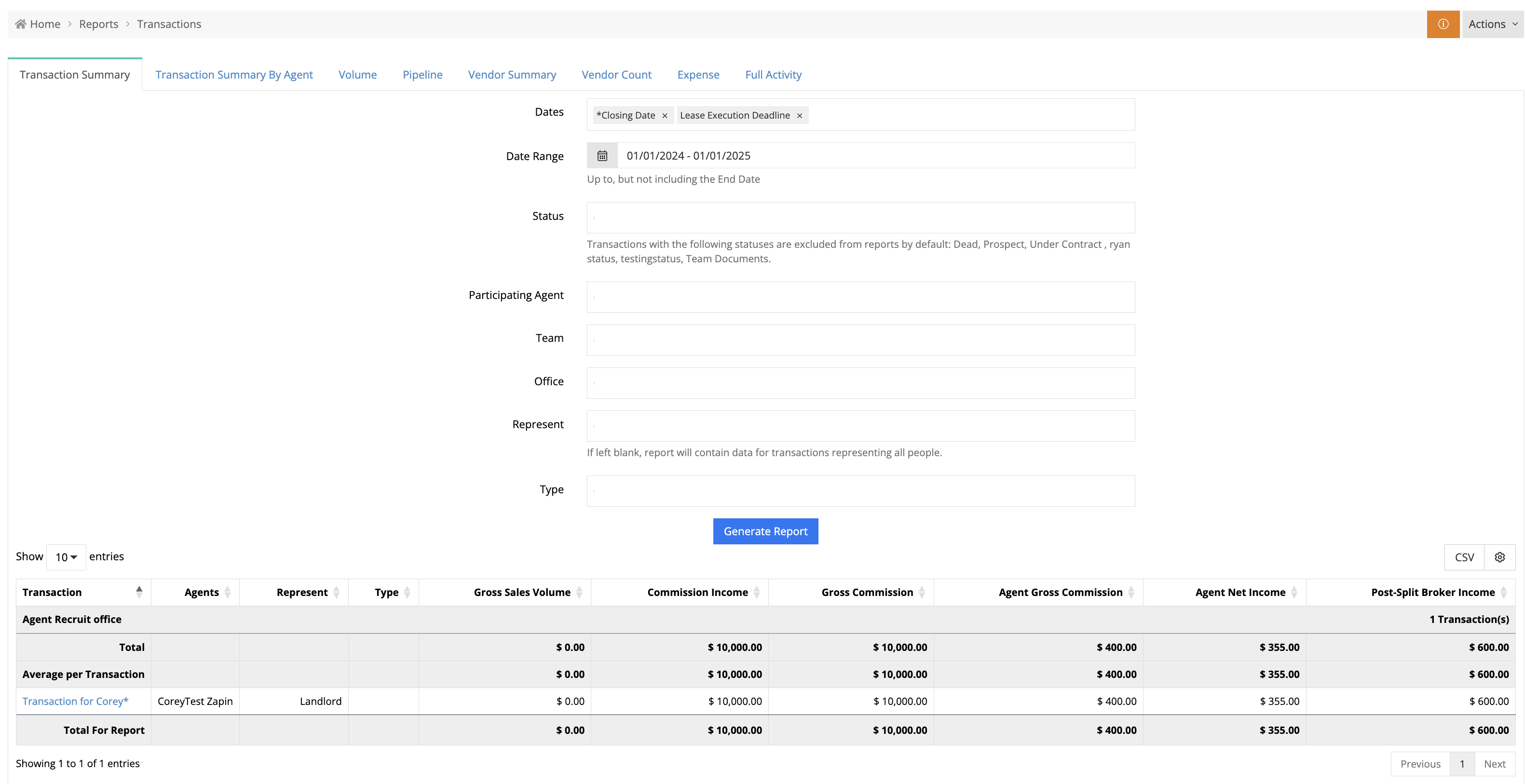 Here, you can run a report that shows the Transaction, Gross Sales Volume, Gross Commission, Agent Gross Commission, Agent Net Income, and Post-Split Broker Income