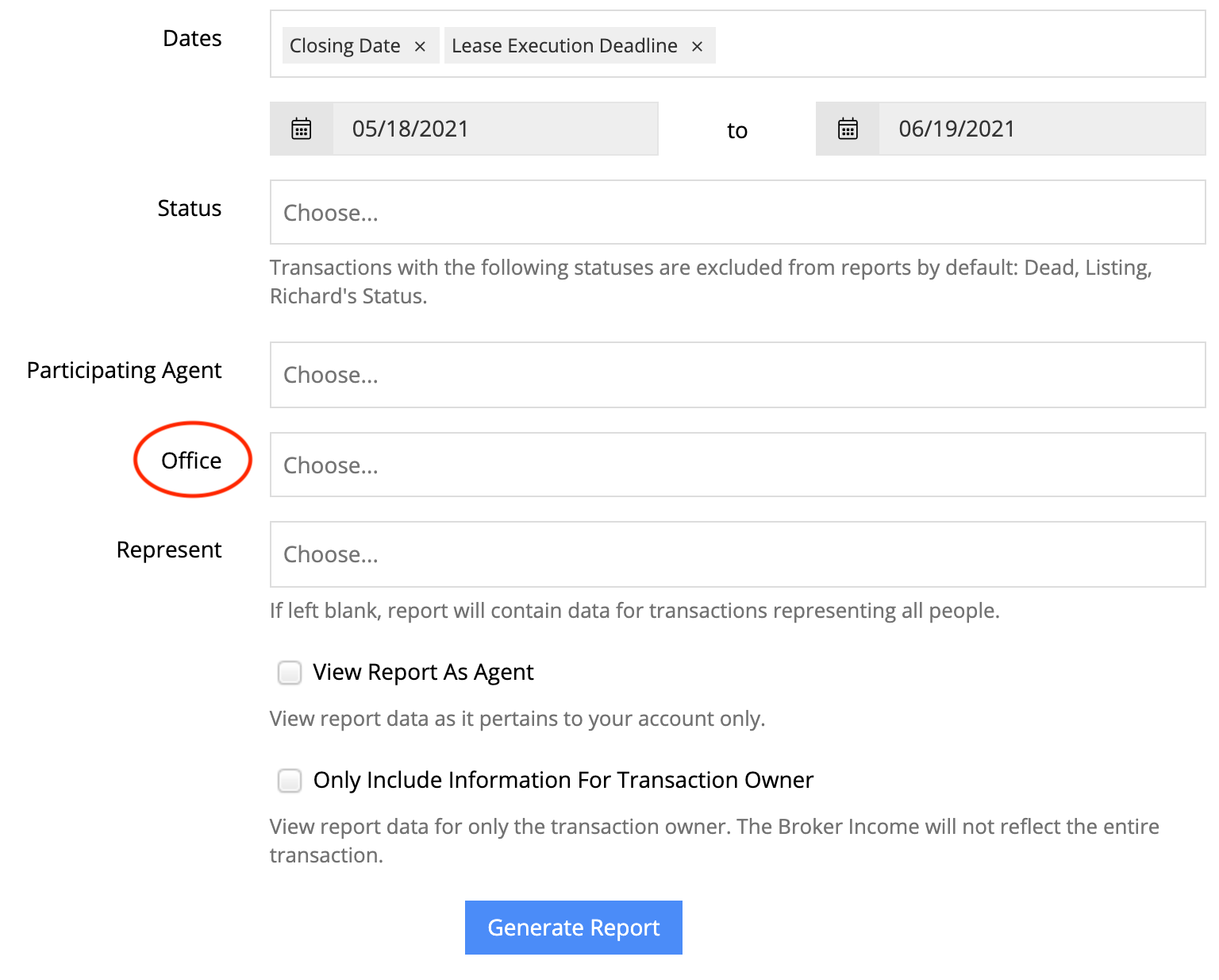 Office: Here, you can narrow down your search by choosing which offices are included in your search. Your ability to select offices will be contingent on your assigned role in TotalBrokerage. To do so, click inside the text box to the right of Office and select the appropriate office(s) you want to include.