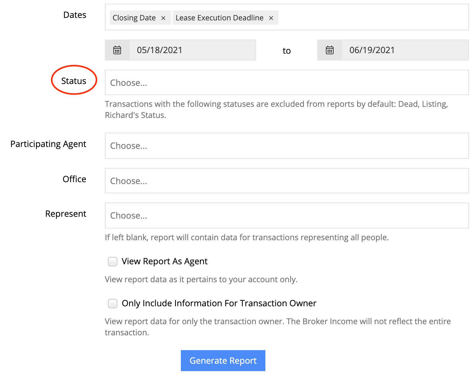 Statuses: Click inside the Status box to select the status(s) that you want included in this report. (Note: Dead transactions are excluded from the report data). After you have made your selection, click Add.