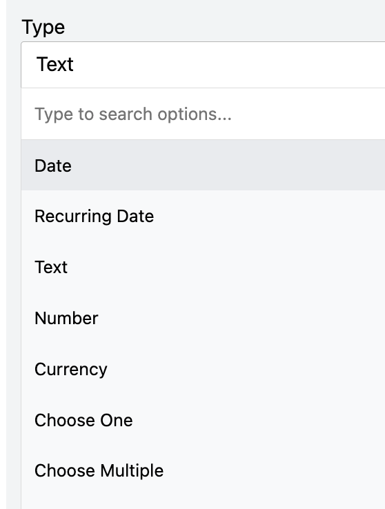 - Recurring Date (used for dates which will automatically advance based on a specified time frame. Today's date is the earliest that can be selected.)