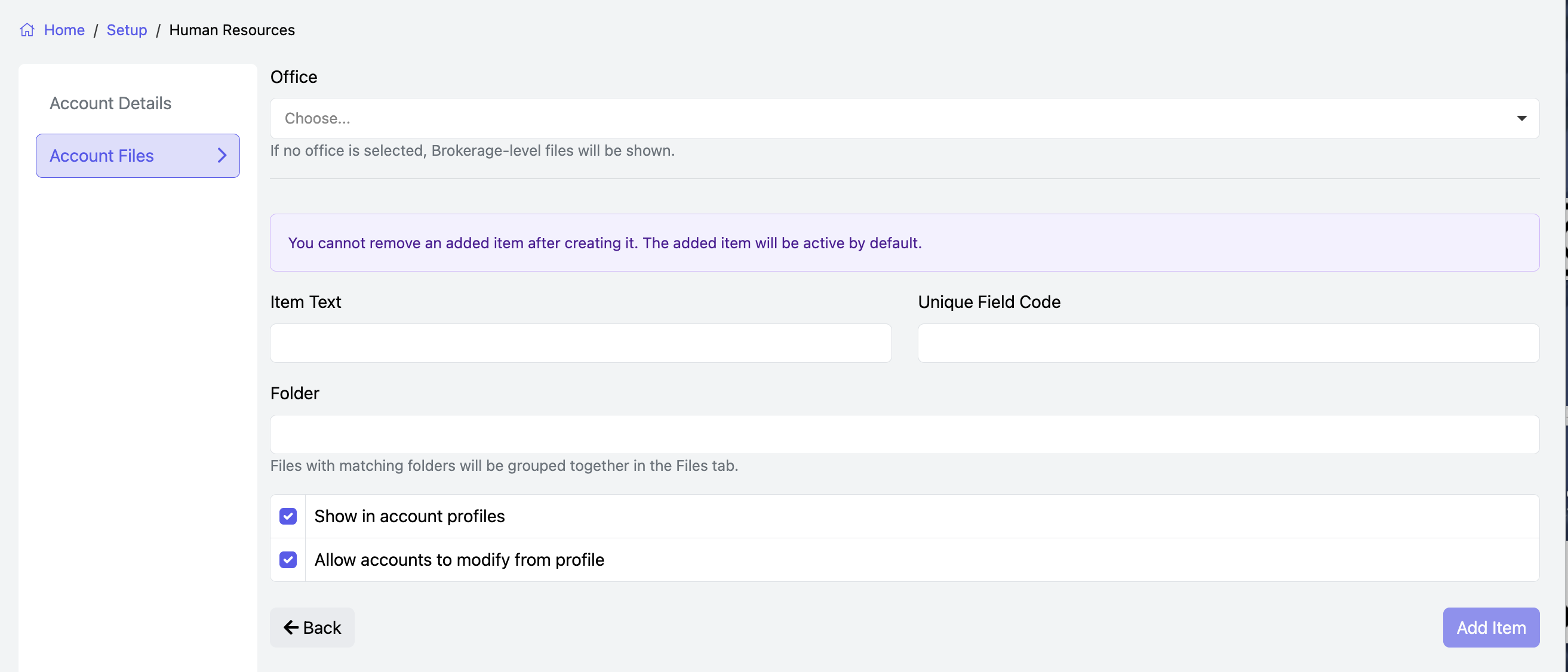 - Click the blue “Add Item” button to save the field.